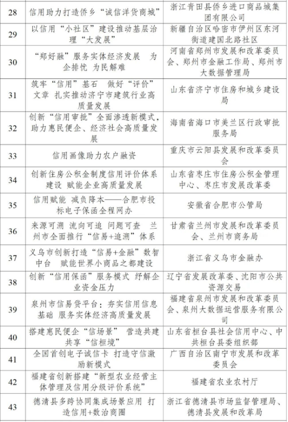现向社会公开发布评选出的80个“信易+”应用典型案例名单,具体案例内容后续将进行展播,供各地方学习借鉴,复制推广典型做法和成功经验,引导经营主体树立诚信兴商经营理念,助力形成全社会“知信、守信、用信”的大格局,为构建新发展格局、推动经济社会高质量发展贡献力量。