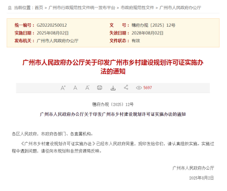 2025年8月2日,《广州市乡村建设规划许可证实施办法》(穗府办规〔2025〕12号)正式印发实施,为全市乡村建设规划管理提供了清晰的制度依据和操作指引。该办法聚焦于全市七区村庄规划确定的集体建设用地范围内的村民住宅建设,明确坚持“先规划、后许可、再建设”的原则,倡导节约集约用地、严守耕地保护红线,并进一步优化审批流程,提升政务服务的便民性和透明度。