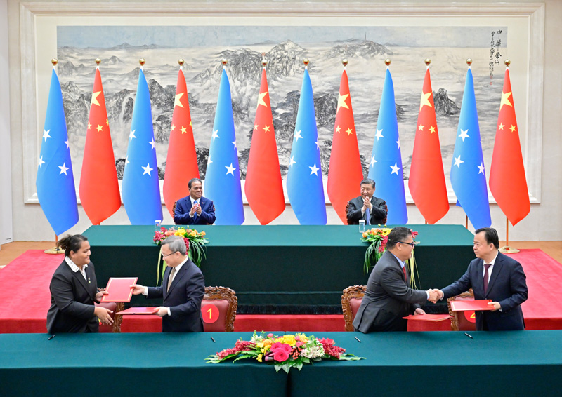 4月9日下午,国家主席习近平在北京人民大会堂同来华进行国事访问的密克罗尼西亚联邦总统西米纳举行会谈。这是会谈后,两国元首共同见证签署关于共建“一带一路”、绿色发展、农业、医疗卫生、基础设施、发展合作等领域多项双边合作文件。