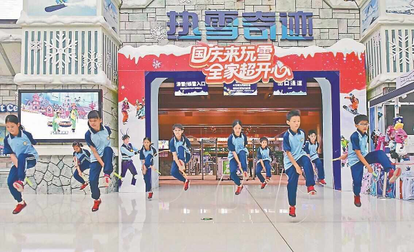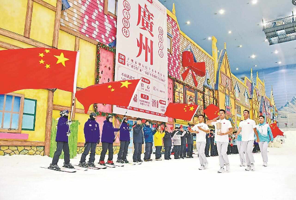 现场还进行了一场特别互动,第十四届全国冬季运动会高山滑雪冠军领队与教练拉起写着“激情全运会 活力大湾区 魅力新广州”字样的长条横幅,挥舞着国旗从雪道上缓缓滑下,场面极为震撼。花都跳绳队10名队员也带来独具当地特色的花式跳绳技艺展演,将现场气氛推向了高潮。
