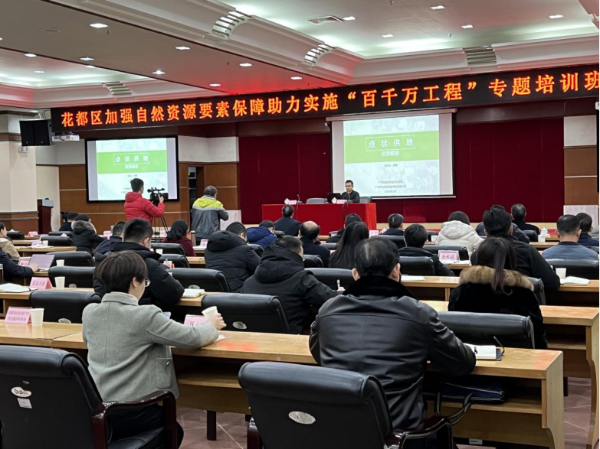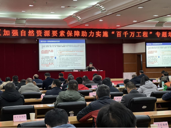 为做好自然资源要素保障,促进城乡区域协调发展,助力实施“百县千镇万村高质量发展工程”,1月25日下午,我区邀请了市规划和自然资源局耕地保护和村庄规划处林锡艺处长、市交通规划研究院有限公司城市规划与策划所刘玮总工程师开展“自然资源要素保障助力实施百千万工程”专题授课培训。区“百千万工程”指挥部领导、区“百千万工程”指挥部各成员单位主要负责同志和各镇(街)党政主要领导、区“百千万工程”指挥办等100多人参加了本次培训。