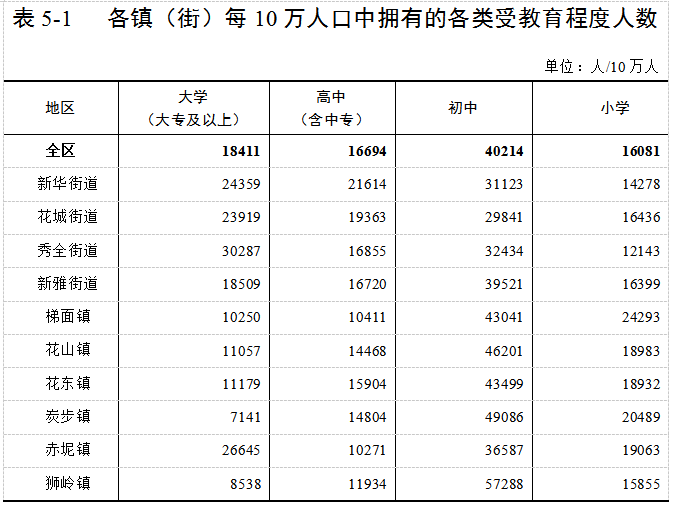 全区常住人口[2]中,拥有大学(指大专及以上)文化程度的人口为302382人;拥有高中(含中专)文化程度的人口为274183人;拥有初中文化程度的人口为660461人;拥有小学文化程度的人口为264110人(以上各种受教育程度的人口包括各类学校的毕业生、肄业生和在校生)。与2010年第六次全国人口普查相比,每10万人中拥有大学文化程度的由9886人上升为18411人;拥有高中文化程度的由17176人下降为16694人;拥有初中文化程度的由46967人下降为40214人;拥有小学文化程度的由19187人下降为16081人。
