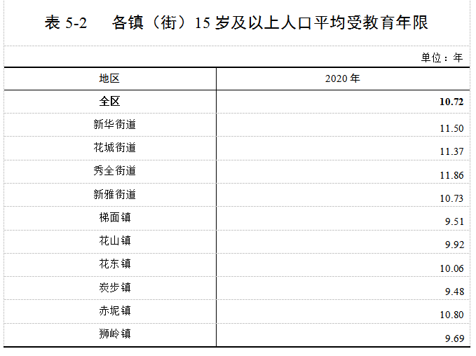与2010年第六次全国人口普查相比,全区常住人口中,15岁及以上人口的平均受教育年限由9.72年提高至10.72年,10个镇(街)中,6个镇(街)平均受教育年限在10年以上。