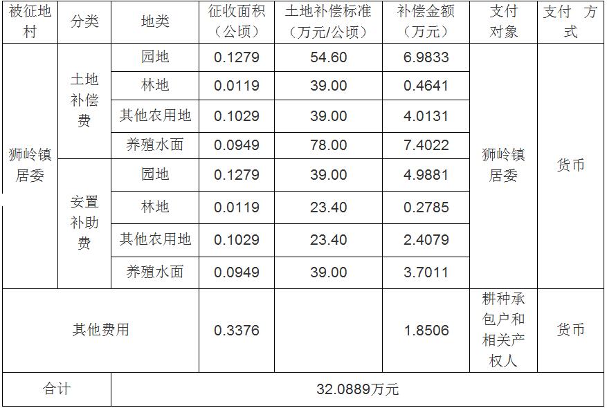 狮岭镇居委属下的集体土地0.3376公顷(合5.0640亩)征收为国有土地。现将经依法批准的《征收土地方案》和市人民政府批准的《征地补偿安置方案》内容和有关事项公告如下: