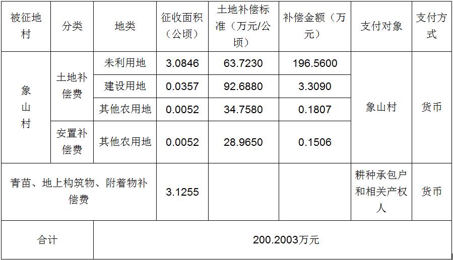 花都区花东镇象山村属下的集体土地3.1255公顷(合46.8825亩),其中其他农用地0.0052公顷(合0.078亩),集体建设用地0.0357公顷(合0.5355亩),未利用地3.0846公顷(合46.269亩)。
