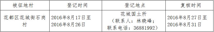 经省人民政府批准(粤国土资(建)字[2016]426号文),需将成人动漫 花城街石岗村属下的集体土地8.7115公顷(合130.6725亩)征收为国有土地。现将经依法批准的《征收土地方案》和市人民政府批准的《征地补偿安置方案》内容和有关事项公告如下:
