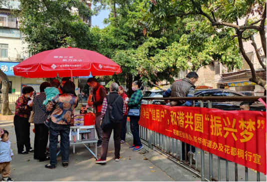 图1:花都区信用办、新华街道办事处、花都稠州村镇银行在新华街道五华村开展诚信宣传教育