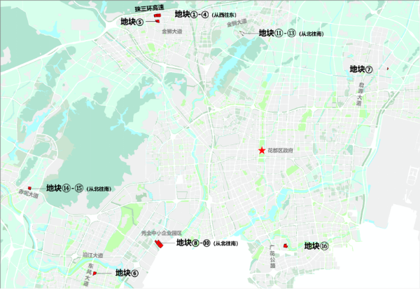 花都区秀全中小企业园区,地块⑧占地面积0.95公顷,地块⑨占地面积4.58公顷,地块⑩占地面积4.54公顷;花都区狮岭镇金狮大道南侧,地块⑪占地面积0.11公顷,地块⑫占地面积0.01公顷,地块⑬占地面积0.17公顷;花都区赤坭镇赤坭大道北,地块⑭占地面积1.22公顷,地块⑮占地面积1.08公顷;花都区新雅街广花公路东,地块⑯占地面积3.50公顷。