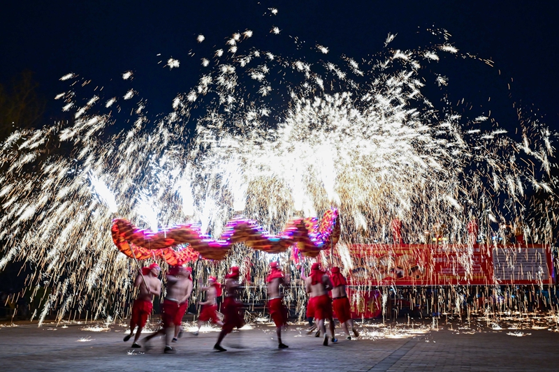 民间艺人在河南省洛阳市2024隋唐河洛文化庙会上表演打铁花(2024年2月14日摄)。