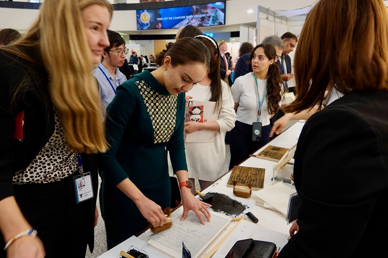 2023年5月2日,在奥地利维也纳联合国城举行的2023年维也纳联合国中文日系列活动上,参访者体验中国传统拓印。新华社发