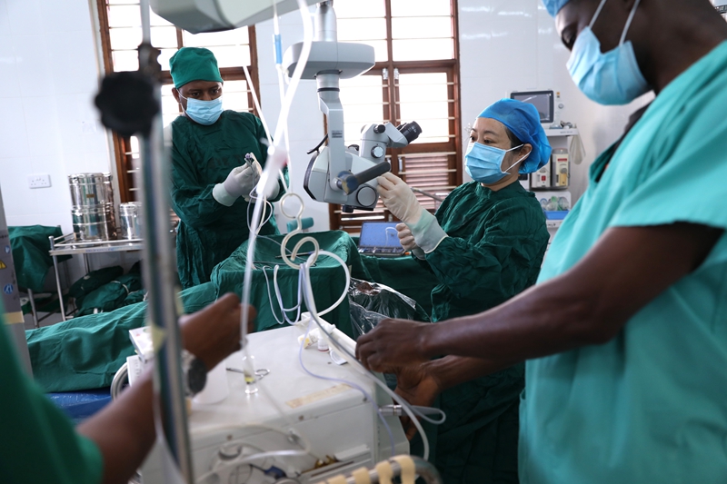2023年2月23日,在坦桑尼亚桑给巴尔岛纳兹莫加医院,第32期中国援桑给巴尔医疗队的眼科医生董莉莉(右二)与桑给巴尔同事一起做术前准备。