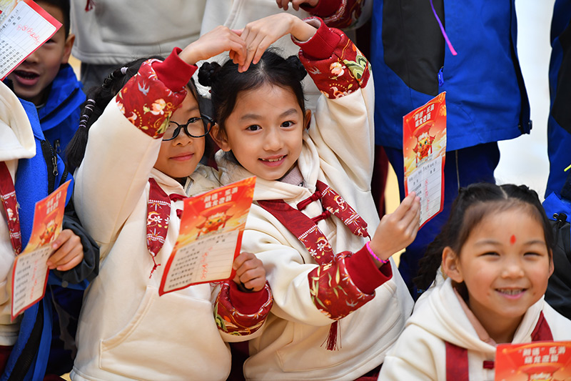 在湖南省长沙市天心区的湖南师大附中双语实验学校,一年级学生在趣味闯关活动中展示自己的闯关卡片(2024年1月18日摄)。