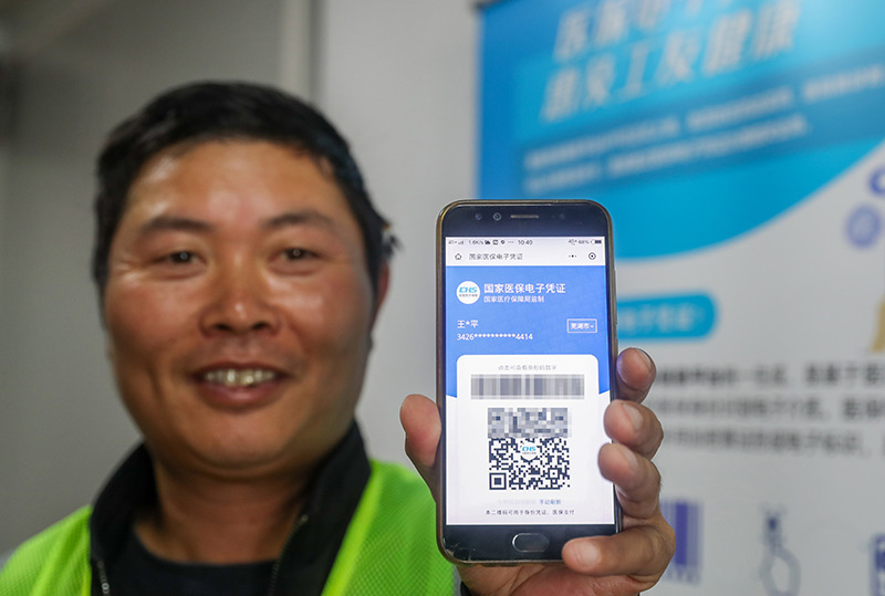 来自安徽的农民工王亚平展示已激活的医保电子凭证(2020年10月20日摄)。