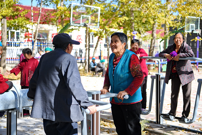 居住在河北省康保县土城子镇互助幸福院的老人们在院子里休闲(2023年10月14日摄)。