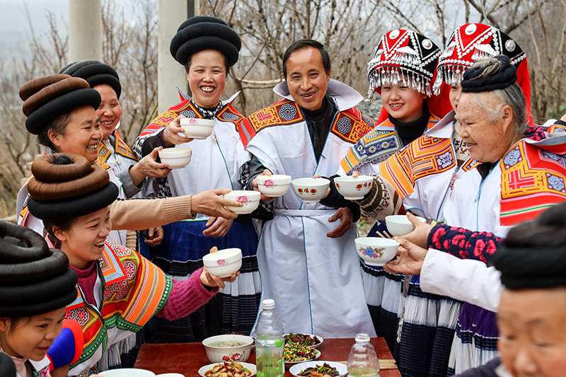 在位于乌蒙山区腹地的贵州省毕节市纳雍县,苗族村民马雍(右五)与妻子黄国琴(左五)在年夜饭上与大家干杯(2021年2月11日摄)。