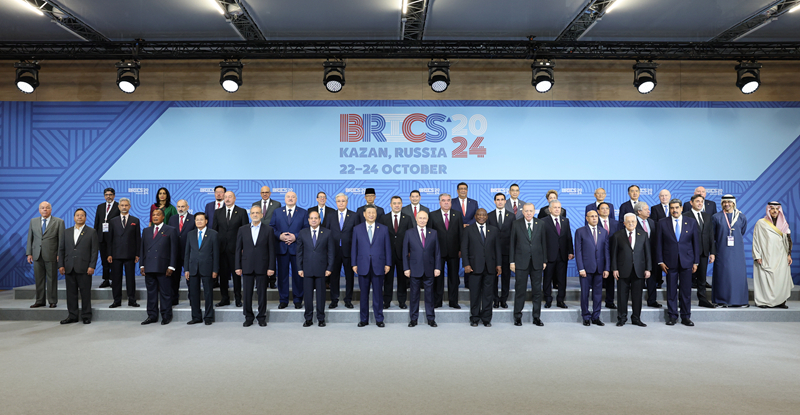当地时间10月24日上午,国家主席习近平在喀山会展中心出席“金砖+”领导人对话会并发表题为《汇聚“全球南方”磅礴力量 共同推动构建人类命运共同体》的重要讲话。这是出席对话会的金砖国家及嘉宾国领导人或代表、国际组织负责人集体合影。