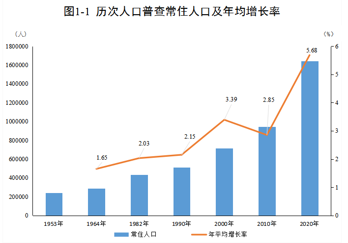 全区常住人口与2010年第六次全国人口普查的945053人相比,十年共增加697307人,增长73.78%,年平均增长率为5.68%。