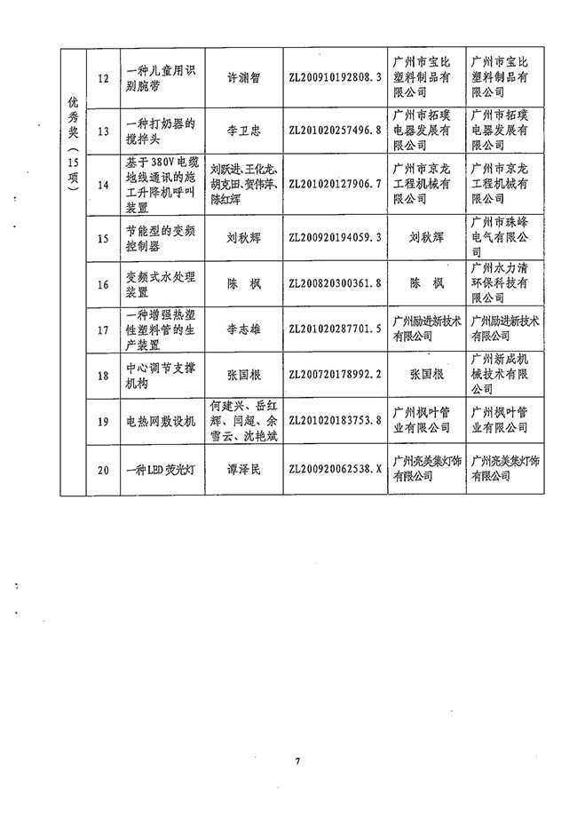 关于授予2010-2011年度花都区科学技术奖和专利奖的通报 【花府[2012]7号】