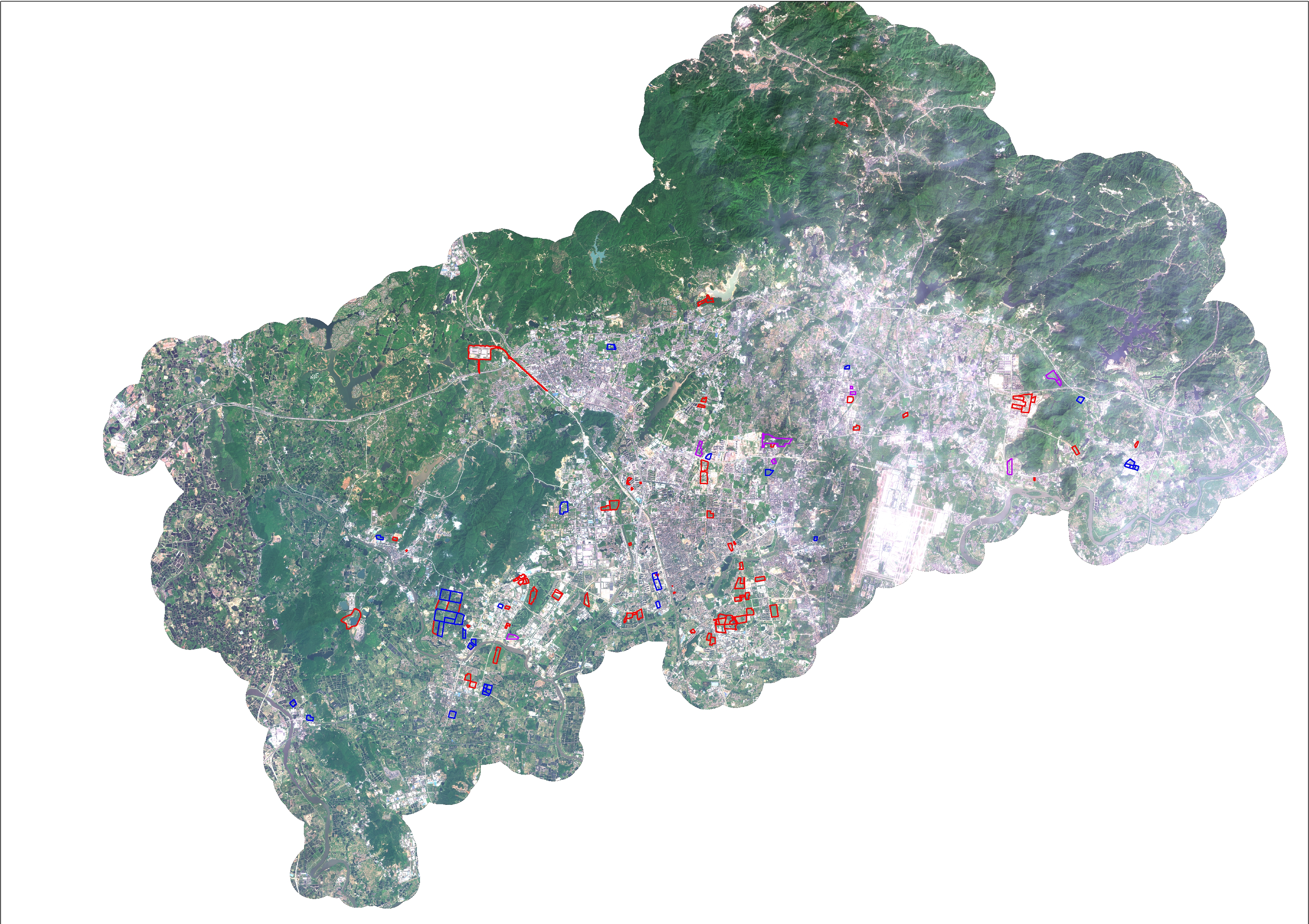 附件:管护土地位置图(影像图红线部分为已结案需要巡查的地块,蓝线与紫线部分为未结案以后收地再进行巡查的地块).jpg