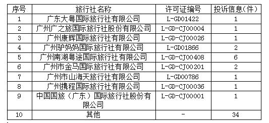 截止2019年9月30日,第三季度花都区文化广电旅游体育局收到旅游投诉59件。其中有9件的投诉主体及投诉人非我区管辖范围,根据属地原则转由其他地方办理。其他投诉热点主要集中在宣传与服务内容不一致、退款纠纷、游客受伤理赔等方面。现按照《旅游法》、《旅行社条例》、《旅行社公告暂行规定》的要求,现将旅游者对旅行社投诉信息公示如下: