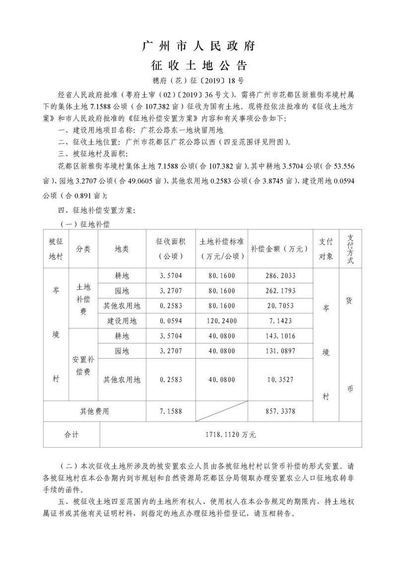 广州市人民政府征收土地公告--穗府(花)征〔2019〕18号