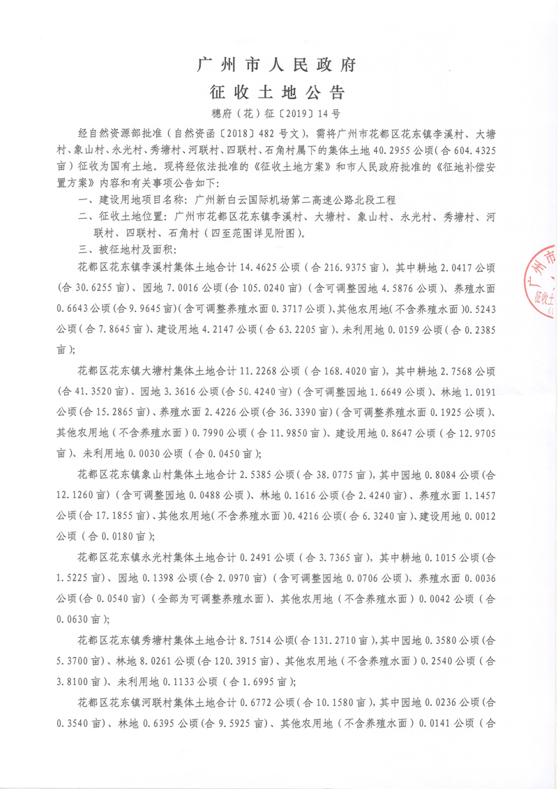 广州市人民政府征收土地公告--穗府(花)征〔2019〕14号