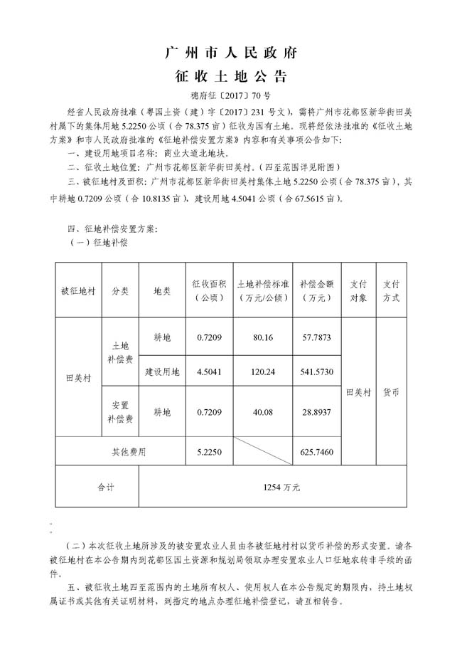 广州市人民政府征收土地公告——穗府征〔2017〕70号