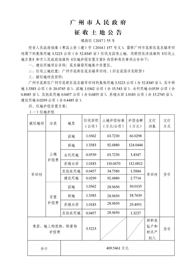 广州市人民政府征收土地公告——穗府征〔2017〕55号
