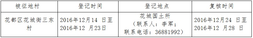 (二)本次征收土地所涉及的被安置农业人员由各被征地村村以货币补偿的形式安置。请各被征地村在本公告期内到花都区国土房管分局领取办理安置农业人口征地农转非手续的函件。