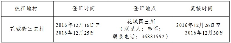 经省人民政府批准(粤国土资(建)字〔2016〕280号文),需将成人动漫 花城街三东村属下的集体土地2.9068公顷(合43.6020亩)征收为国有土地。现将经依法批准的《征收土地方案》和市人民政府批准的《征地补偿安置方案》内容以及有关事项公告如下: