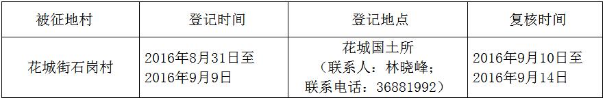经省人民政府批准(粤国土资(建)字〔2016〕183号文),需将成人动漫 花城街石岗村属下的集体土地4.2898公顷(合64.3470亩)征收为国有土地。现将经依法批准的《征收土地方案》和市人民政府批准的《征地补偿安置方案》内容以及有关事项公告如下: