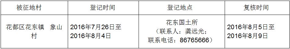 经省人民政府批准(粤国土资(建)字[2014]42号文),需将花都区花东镇象山村属下的集体土地3.1255公顷(合46.8825亩)征收为国有土地。现将经依法批准的《征收土地方案》和市人民政府批准的《征地补偿安置方案》内容和有关事项公告如下: