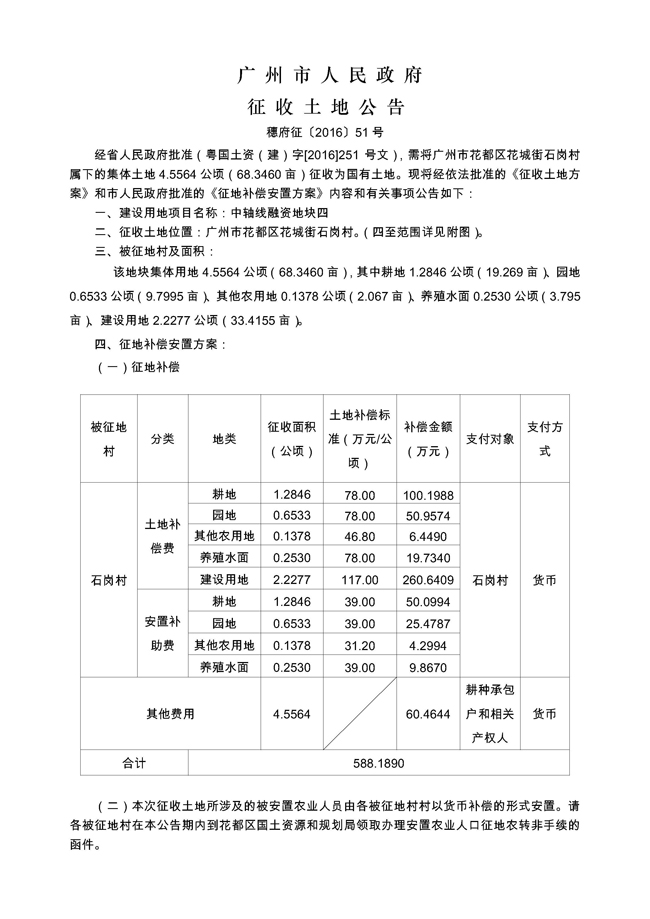 广州市人民政府征收土地公告——穗府征〔2016〕51号