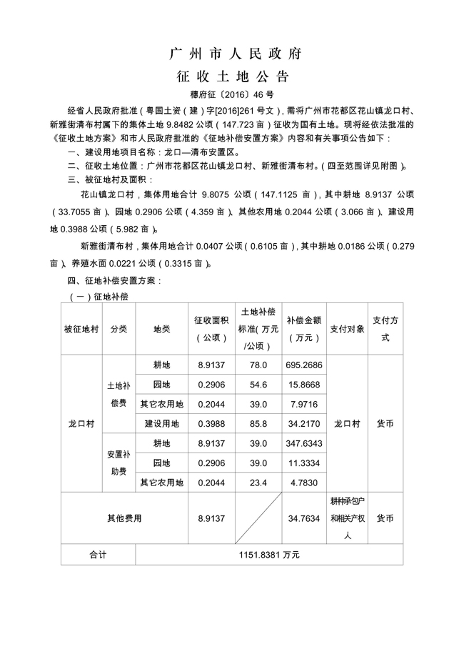 广州市人民政府征收土地公告——穗府征〔2016〕46号