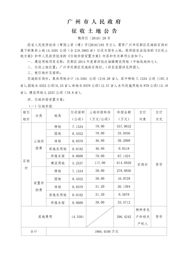 广州市人民政府征收土地公告——穗府征〔2016〕29号