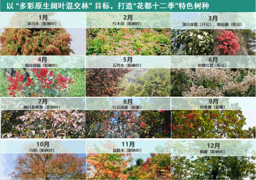 以规划为依托,一幅“四季皆景”的原生森林山水画卷正徐徐展开。春季以荷木、五列木、润楠属等彩叶及软荚红豆、千年桐为主;夏季林冠层浓郁翠绿及至秋冬,铁冬青、大头茶纷纷披上彩叶、挂满彩果,与落羽杉的赭红、枫香的斑斓交织辉映,重现原生多样、季相分明的森林风貌。